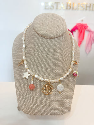 This elegant pearl charm necklace exudes a delicate and timeless beauty. Adorned with freshwater pearls and gold-accented charms, including a star, floral motifs, and a lustrous pearl pendant, this piece is perfect for adding a touch of sophistication to any outfit.