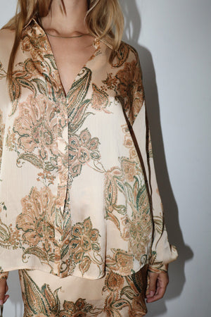 Beatrice Paisley Button Down Blouse Elevate your wardrobe with this sophisticated paisley button down blouse, a versatile piece that seamlessly transitions from office to weekend wear. The intricate paisley print adds visual interest and depth, while the classic button-down silhouette ensures timeless appeal. Crafted for comfort and style, this blouse pairs effortlessly with tailored trousers, denim, or skirts. The structured fit provides a polished appearance suitable for professional settings or casual outings. An essential addition to any thoughtfully curated closet.