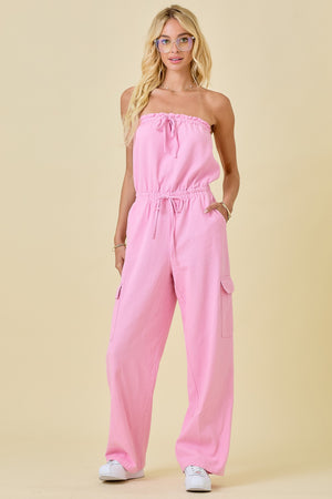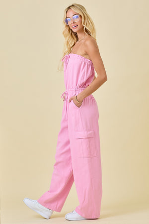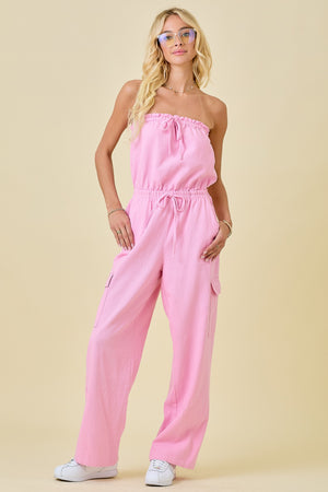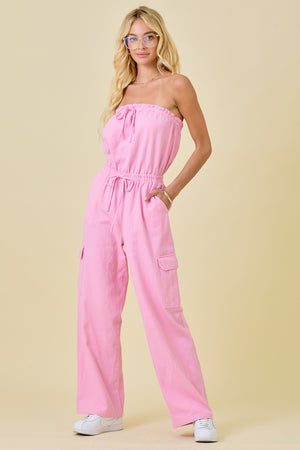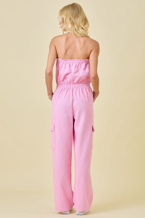 The Bella Pink Cargo Jumpsuit redefines casual chic with its strapless denim design, offering a fresh and confident silhouette. Functional cargo pockets combined with delicate ruffle accents create a balanced blend of utility and femininity. The adjustable tie at the waist allows for a customized fit, enhancing comfort and shape. Ideal for those seeking versatile style with an edge.
