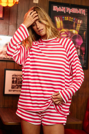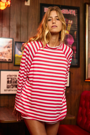 Elevate your casual wardrobe with this striking oversized top, featuring a sophisticated mock-neck silhouette and bold striped detailing. The raglan sleeves provide an effortless, relaxed fit that flatters while allowing unrestricted movement—ideal for layering or wearing solo. Rich red tones command attention without sacrificing versatility, pairing seamlessly with denim, neutrals, or statement pieces. Perfect for those who appreciate quality construction and timeless style that transcends seasonal trends.