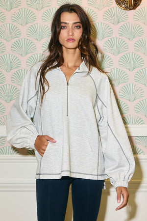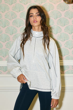 The Brynn Grey Pullover combines functional design with refined comfort. Featuring a reverse stitched half zip-up front, it offers adjustable ventilation and style versatility. Raglan sleeves enhance mobility, while the front kangaroo pocket provides convenient storage and warmth. Side slits at the bottom ensure a relaxed fit and ease of movement, making this pullover ideal for layering or standalone wear.