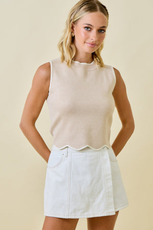 This sleeveless knit top features a refined scalloped hem edge in contrasting color, adding a subtle yet sophisticated detail to your wardrobe. Crafted for comfort and style, its lightweight knit fabric ensures breathability and ease of movement, making it an ideal choice for layering or wearing alone in warmer weather. The Daviana Scalloped Top combines expert tailoring with thoughtful design to elevate everyday essentials.