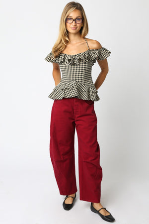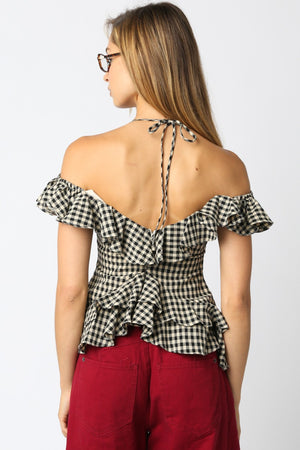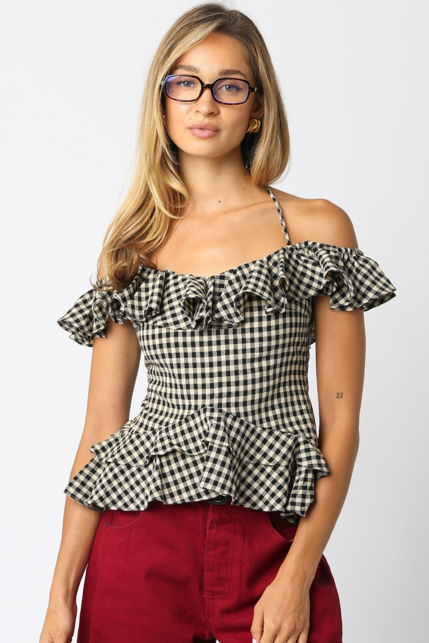 The Edith Checkered Ruffle Top combines a classic checkered pattern with a modern silhouette, featuring a flattering halter neck and a delicately ruffled hem. This design enhances movement and adds a touch of feminine elegance, making it suitable for both casual outings and sophisticated occasions. Crafted for comfort and style, it effortlessly elevates your wardrobe with a timeless yet contemporary appeal.