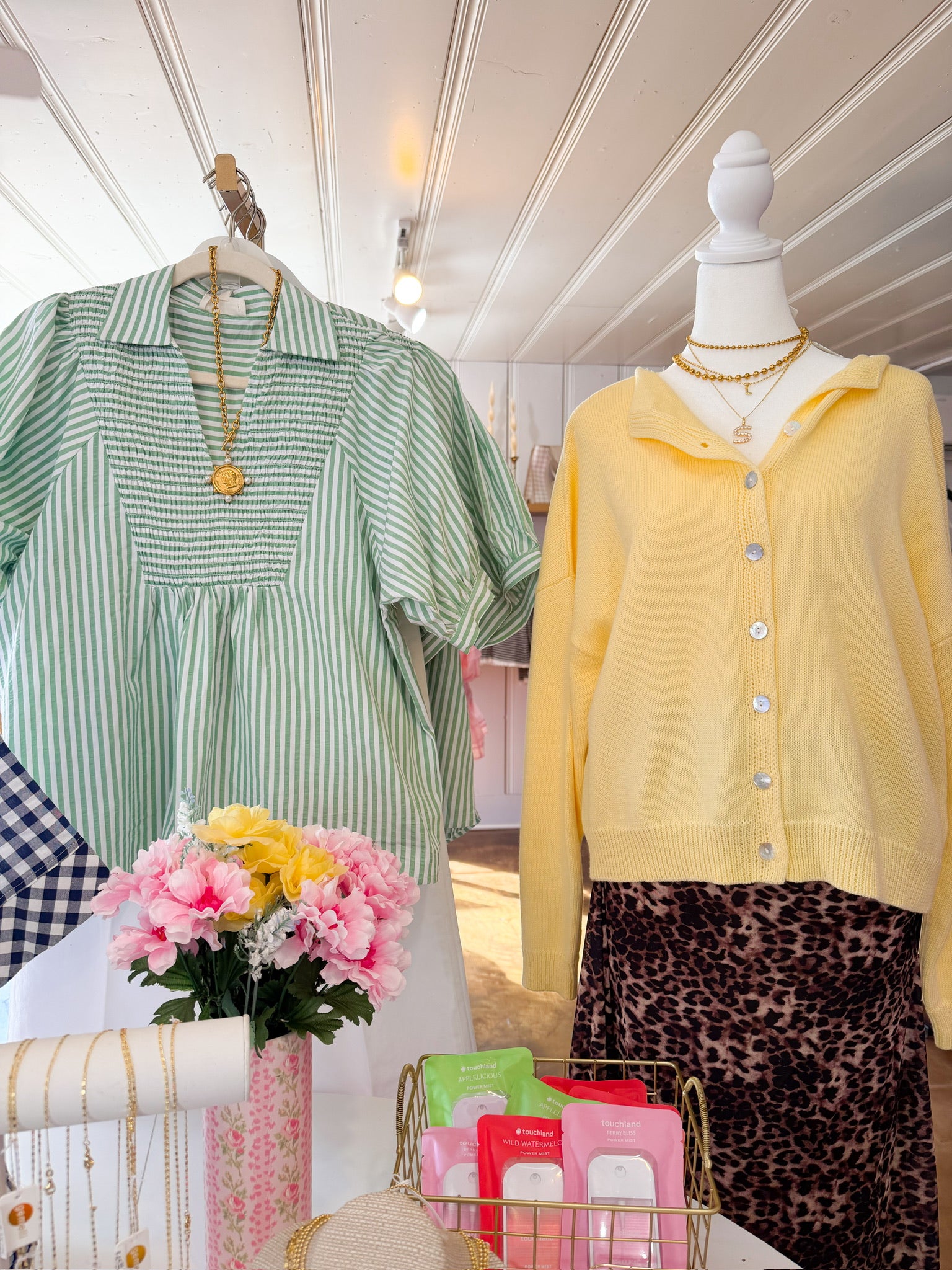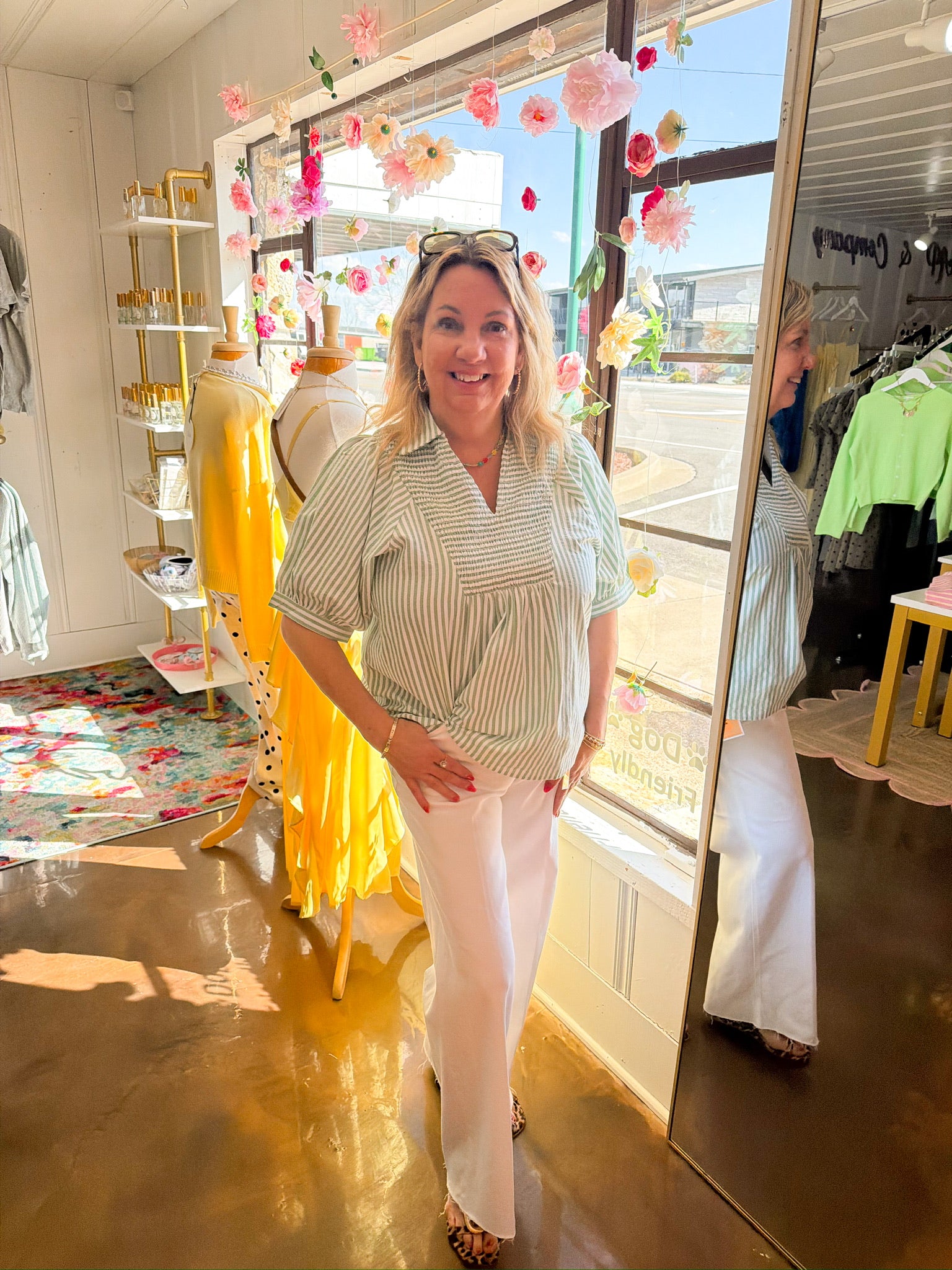 Ella Sage Striped Top Elevate your casual wardrobe with this timeless striped essential. Crafted from premium fabric, the Ella Sage features classic horizontal stripes in a sophisticated sage palette that pairs effortlessly with your game-day looks or everyday style. The relaxed fit ensures comfort without sacrificing polish, making it an ideal layering piece or standalone statement. Perfect for fans who appreciate quality basics with understated elegance.