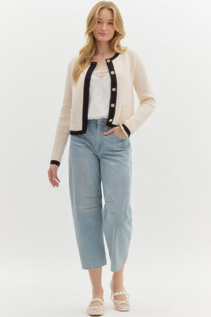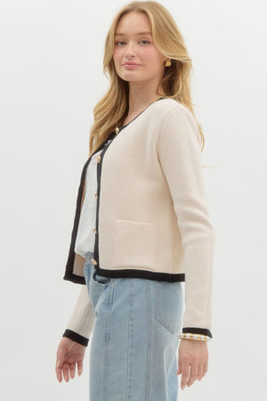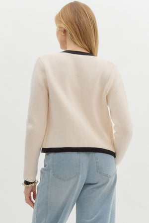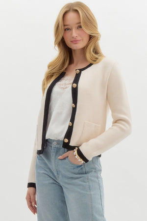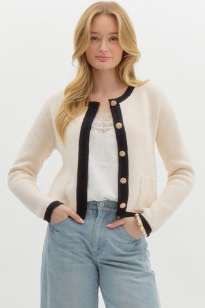 This solid long sleeve sweater knit cardigan features a contrasting band finish and a chic gold front button closure. Unlined and lightweight, it offers a stylish, non-sheer design that's perfect for layering or adding a touch of elegance to any outfit.