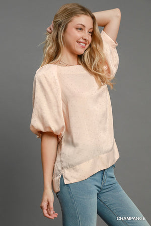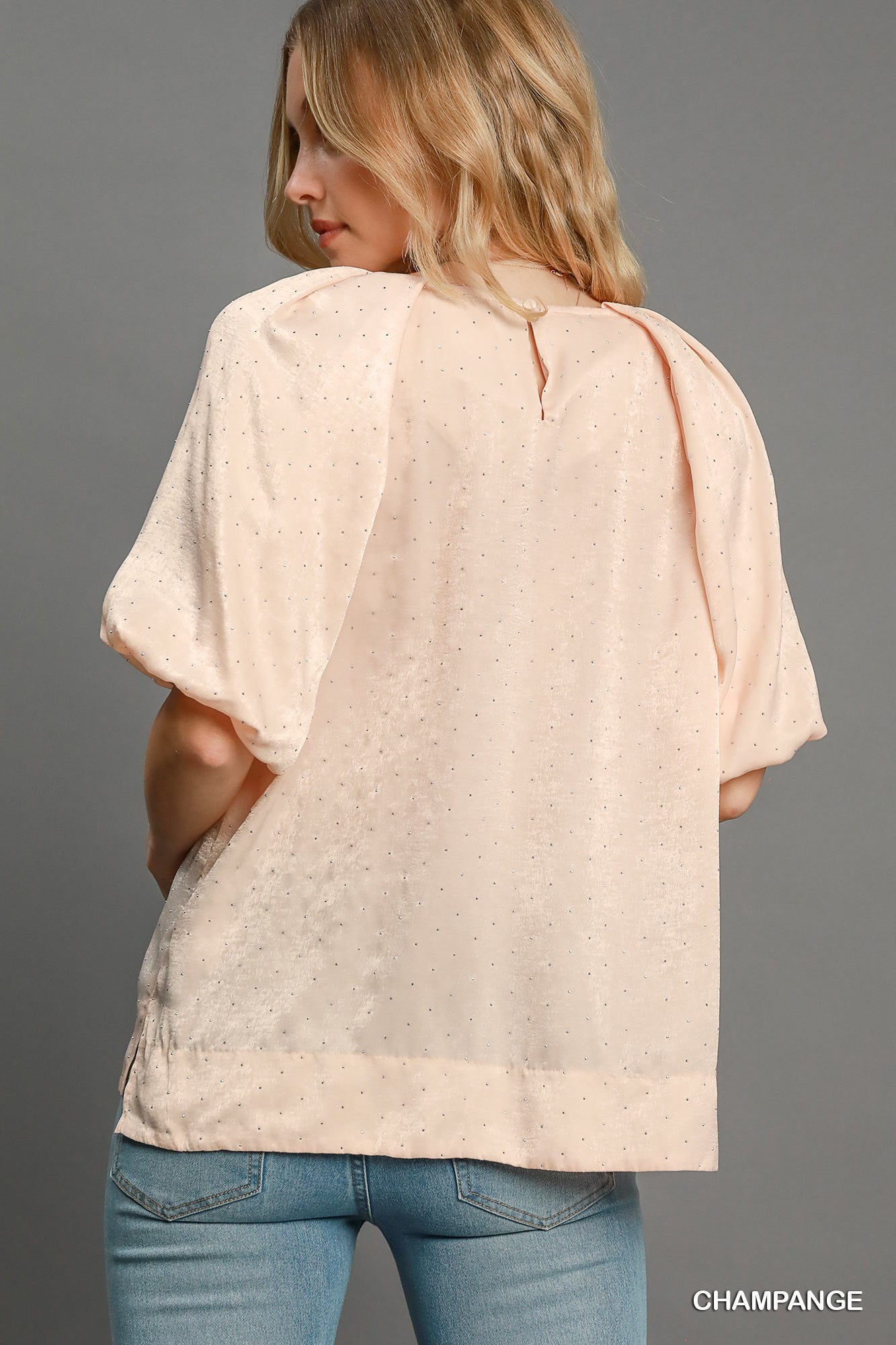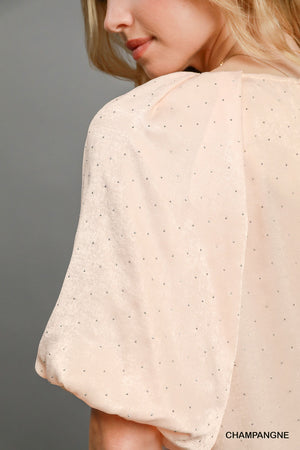 The Gen Champagne Top combines luxe rhinestone satin with contemporary silhouette details for a standout piece. Puff sleeves add dimension and movement, while the round neckline offers a flattering, versatile fit. Lined sleeves ensure comfort and durability against the delicate fabric. Perfect for game-day celebrations, nights out, or any occasion calling for elevated sparkle and sophistication.