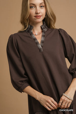 Made from soft French Terry fabric, the Grace Chocolate Dress features a sophisticated V-neck highlighted by subtle plaid trim. Its 3/4 length puff sleeves add elegant volume, while the relaxed A-line silhouette ensures comfort and effortless style. The flowy ruffle hem reveals a tasteful plaid lining peek, bringing a refined touch to this unlined dress perfect for versatile wear.