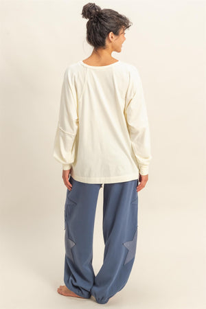 The Hailey Long Sleeve Cream top offers a perfect blend of casual style and comfort. Its classic crew neckline and relaxed fit, complemented by drop shoulder seams and extended sleeves, create a laid-back yet refined silhouette. Side slits add a contemporary detail and allow for greater freedom of movement. Crafted from soft, breathable fabric, this top ensures all-day comfort. Ideal for pairing with jeans or leggings, it delivers an effortlessly polished look suitable for everyday wear.