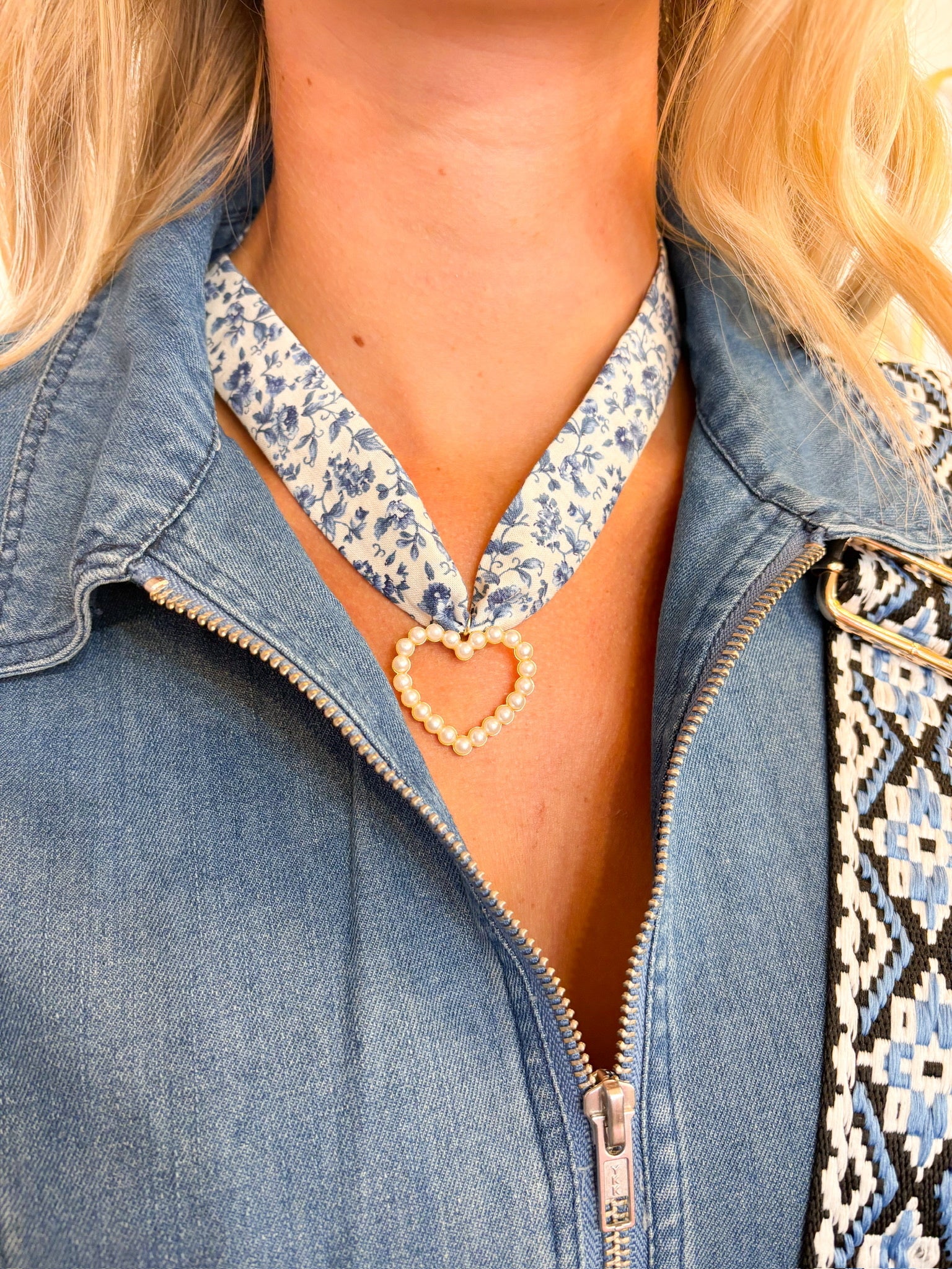 A locally made ribbon necklace featuring delicate blue floral fabric and a charming pearl heart pendant, offering a touch of timeless elegance with a handmade appeal.