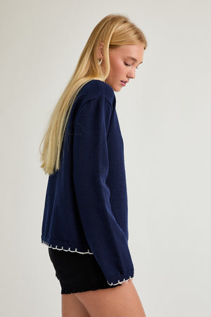 The Lara Navy Cardigan combines timeless tailoring with modern versatility. Crafted with precision blanket stitching along the edges, this piece delivers refined detail that elevates any wardrobe. The structured fit works seamlessly for layering over dresses or pairing with basics, while the navy hue ensures effortless coordination with existing pieces. A sophisticated choice for those who value quality construction and understated elegance.