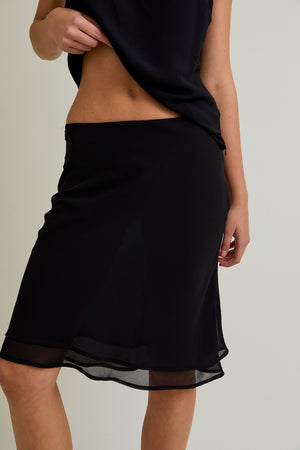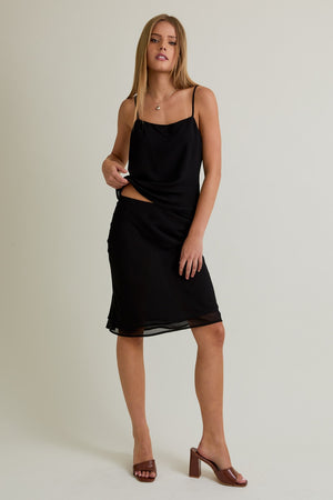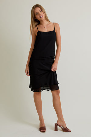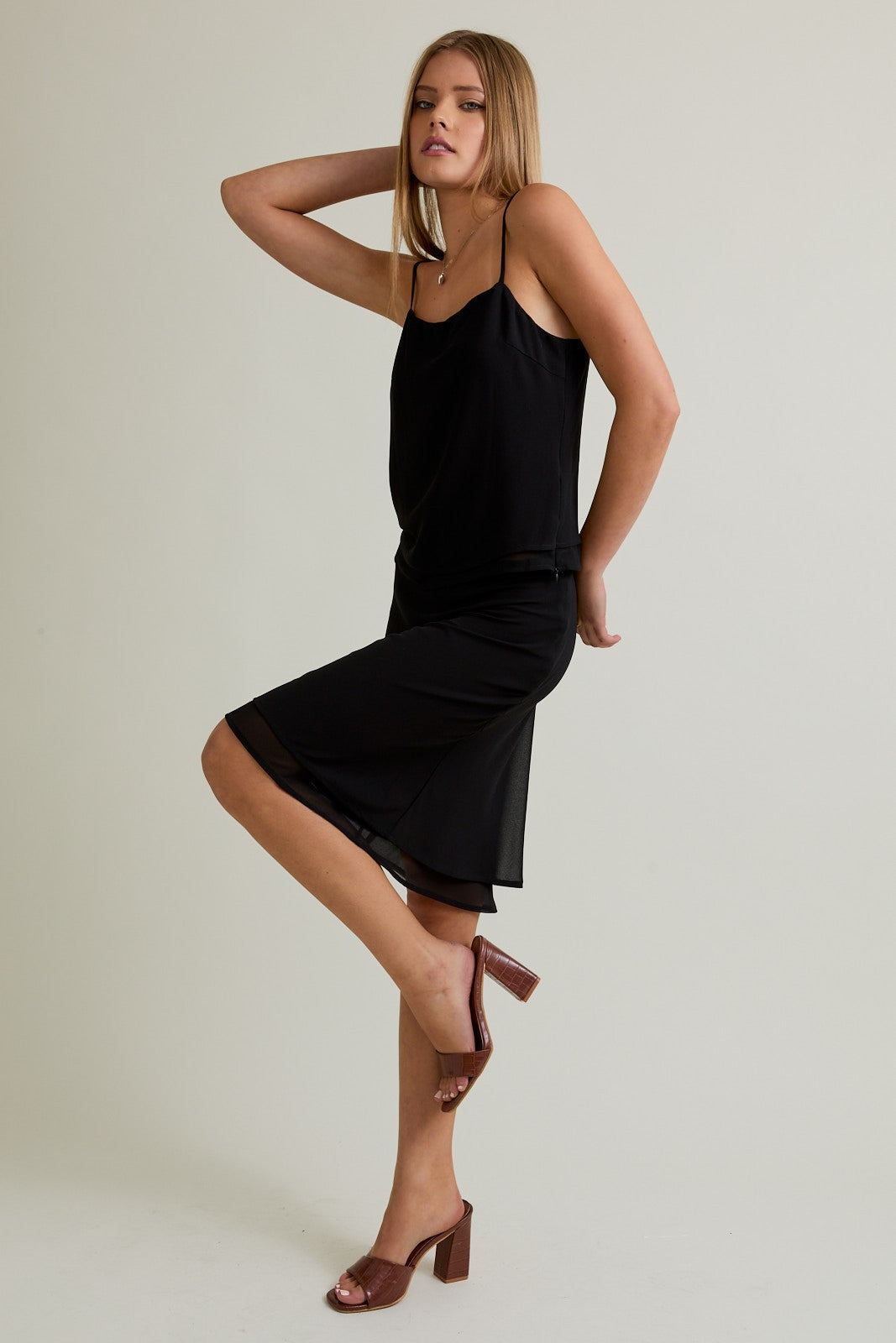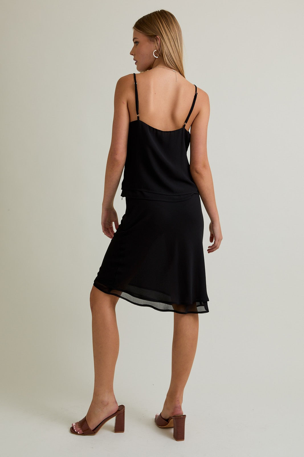 The Lucy Black set features a sleek tubular strap double-layered cami top paired with a flattering mid-length skirt. Designed for a modern silhouette, this ensemble blends minimalist structure with sophisticated layering, offering both comfort and style suitable for various occasions. Its refined design ensures versatility while maintaining an elegant, contemporary edge.