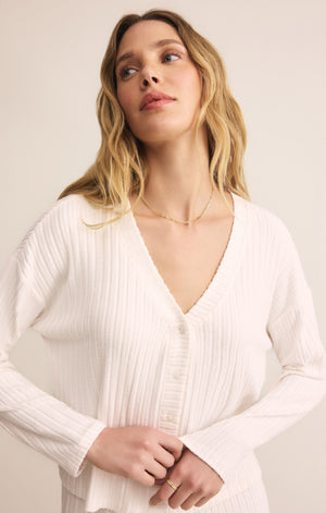 This Mara Rib Cardigan features a V-neck and button-front design with long sleeves for versatile layering. Crafted from a silky rib fabric blend of 97% polyester and 3% spandex, it offers a lightweight yet luxuriously soft texture enhanced by a heavy soft wash. With a regular fit and a 20" length from shoulder, it provides comfortable wear and a flattering silhouette ideal for both casual and polished looks.