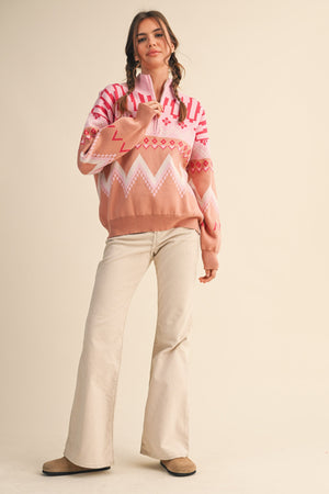 The Miranda Half Zip Pullover combines contemporary geometric knit patterns with timeless layering versatility. Crafted from quality knit fabric, this pullover features a half zip closure for easy adjustment and a refined silhouette that transitions seamlessly from casual to polished settings. The geometric design adds visual interest while maintaining a sophisticated aesthetic. Perfect for layering or wearing solo, this piece delivers both style and functionality for the modern wardrobe.
