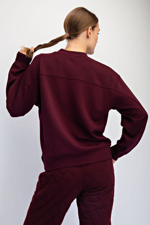 Crafted from modal poly span scuba fabric, this Mock Neck Cherry Pullover offers a silky smooth, lightweight feel ideal for layering or standalone wear. Its relaxed, oversized fit ensures comfort without sacrificing style, while the mock neck provides subtle sophistication. Thoughtfully designed with seamed details, this pullover combines contemporary tailoring with effortless ease, making it a versatile addition to any expert wardrobe.