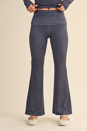 Navy Polka Dot Soft Knit Jersey Foldover Flare Pants combine comfort with contemporary style. Crafted from soft knit jersey fabric, these pants offer a luxurious feel against the skin while maintaining breathability for all-day wear. The foldover waistband provides a flattering, adjustable fit, while the flare silhouette creates a dynamic, fashion-forward look. Perfect for game days, casual outings, or relaxed weekends, these navy pants with playful polka dots transition effortlessly from stadium to street.