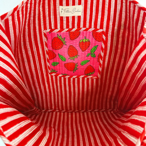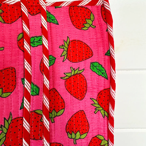 Explore the perfect blend of style and function with our Handmade Pink and Red Strawberry Tote. Oversized quilted tote with vivid, eye-catching print. Reversible with interior pocket, 100% cotton, artisan-made sustainably in small batches - perfect for beach, travel, boutique displays. Features & Details: • Oversized quilted tote bag (17.5" x 17.5") • Reversible design with contrasting interior fabric • Interior pocket for convenient storage • Constructed with 100% cotton, quilted hand printed fabric • Lightweight yet sturdy, perfect for everyday use • Handmade in small batches using traditional artisan techniques • Sustainably and ethically produced