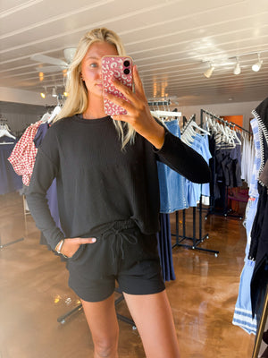 This Rib Long Sleeve Tee & Shorts Set in black offers a balanced combination of comfort and practical design. The round-neck tee provides a classic fit suitable for layering or standalone wear, while the shorts include pockets for convenient storage. Crafted for everyday ease, this set is ideal for both relaxed and active settings.