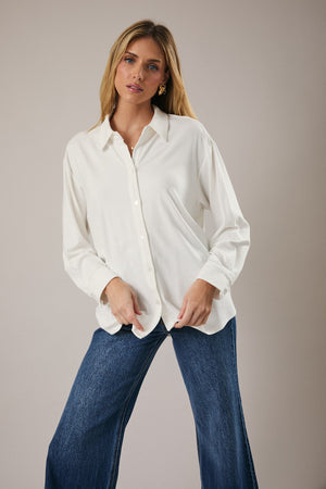 Sally White Button Down Elevate your wardrobe with this long sleeve button down jersey shirt, designed for fans who demand both style and versatility. Crafted with a classic white colorway, this piece transitions seamlessly from tailgate to casual wear. The structured button front provides a polished silhouette while maintaining the comfort you need for all-day wear. Perfect for layering over your favorite team gear or standing alone as a statement piece. Whether you're cheering from the stands or heading out after the game, this jersey shirt delivers the sporty edge AP & Company fans expect.