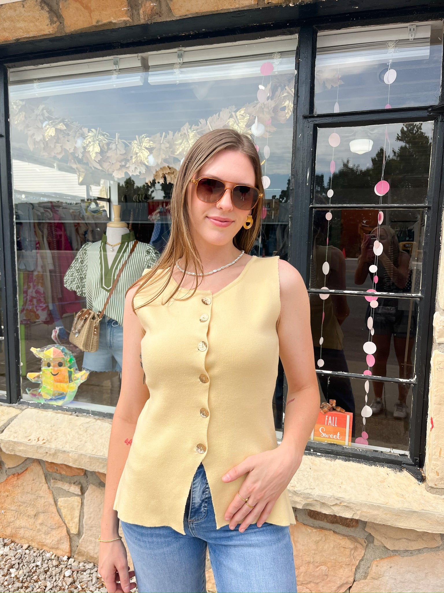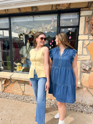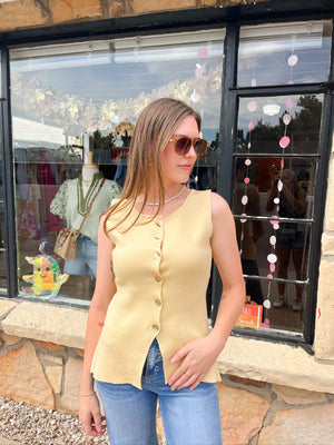 The Sally Yellow Vest is a solid, sleeveless button-down piece designed for layering with ease. Its clean lines and vibrant color add a polished touch to any outfit, making it a versatile wardrobe staple. Ideal for transitional weather, this vest offers both style and functionality without compromising comfort.