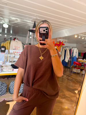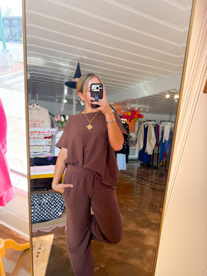 This Slub short sleeve top and pants set in brown is crafted from high-quality fabric, ensuring durability and comfort. The coordinated two-piece design offers effortless style and versatility, suitable for both casual and semi-formal occasions. Its breathable material and thoughtful construction provide ease of movement and lasting wear.