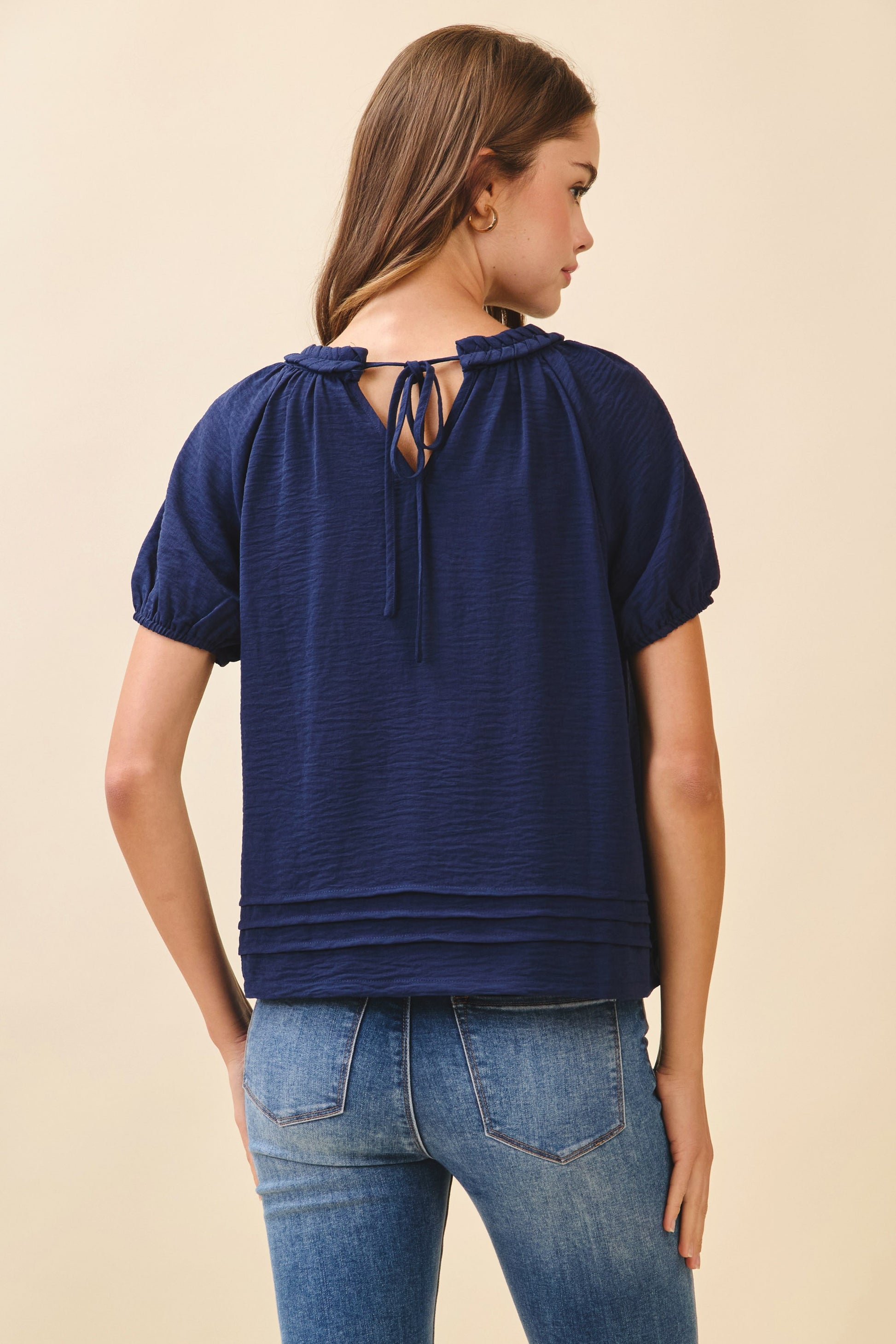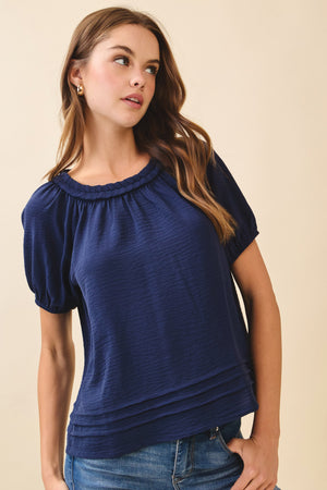 The Tara Navy Top showcases a refined textured finish complemented by short puff sleeves and a relaxed silhouette for effortless comfort. Its round neckline is enhanced by layered pleat details at the hem, adding dimension and movement. A delicate keyhole tie at the back completes the design, offering subtle sophistication ideal for both casual and polished looks.