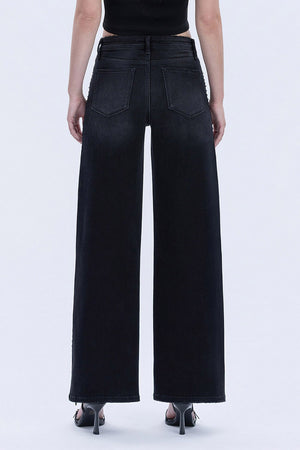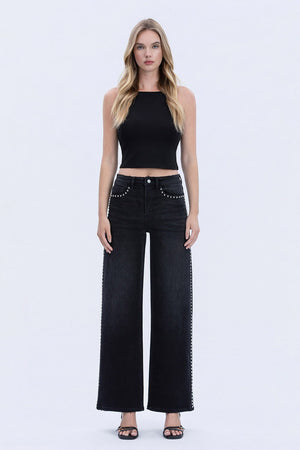 These Vervet High Rise Nail Detail Wide Jeans combine comfort and style with their stretch denim fabric and flattering high-rise waist. Featuring silver dome nail head embellishments for a subtle edge, finished hems, and a full-length wide-leg cut, they offer both a modern silhouette and versatile wearability. Ideal for those seeking a blend of comfort, fashion, and refined detail in their denim collection.