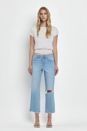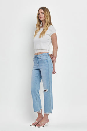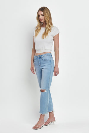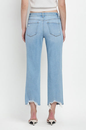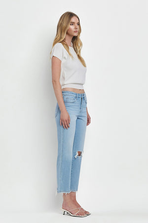 These Vervet High Rise Regular Straight Jeans combine expert craftsmanship with modern style. Featuring comfort stretch denim and a high-rise waist, they offer a flattering fit and all-day ease. Distressed detailing adds a touch of edge, while the raw hem and cropped length create a contemporary silhouette perfect for versatile styling. Ideal for those seeking both comfort and trend-forward denim in one pair.